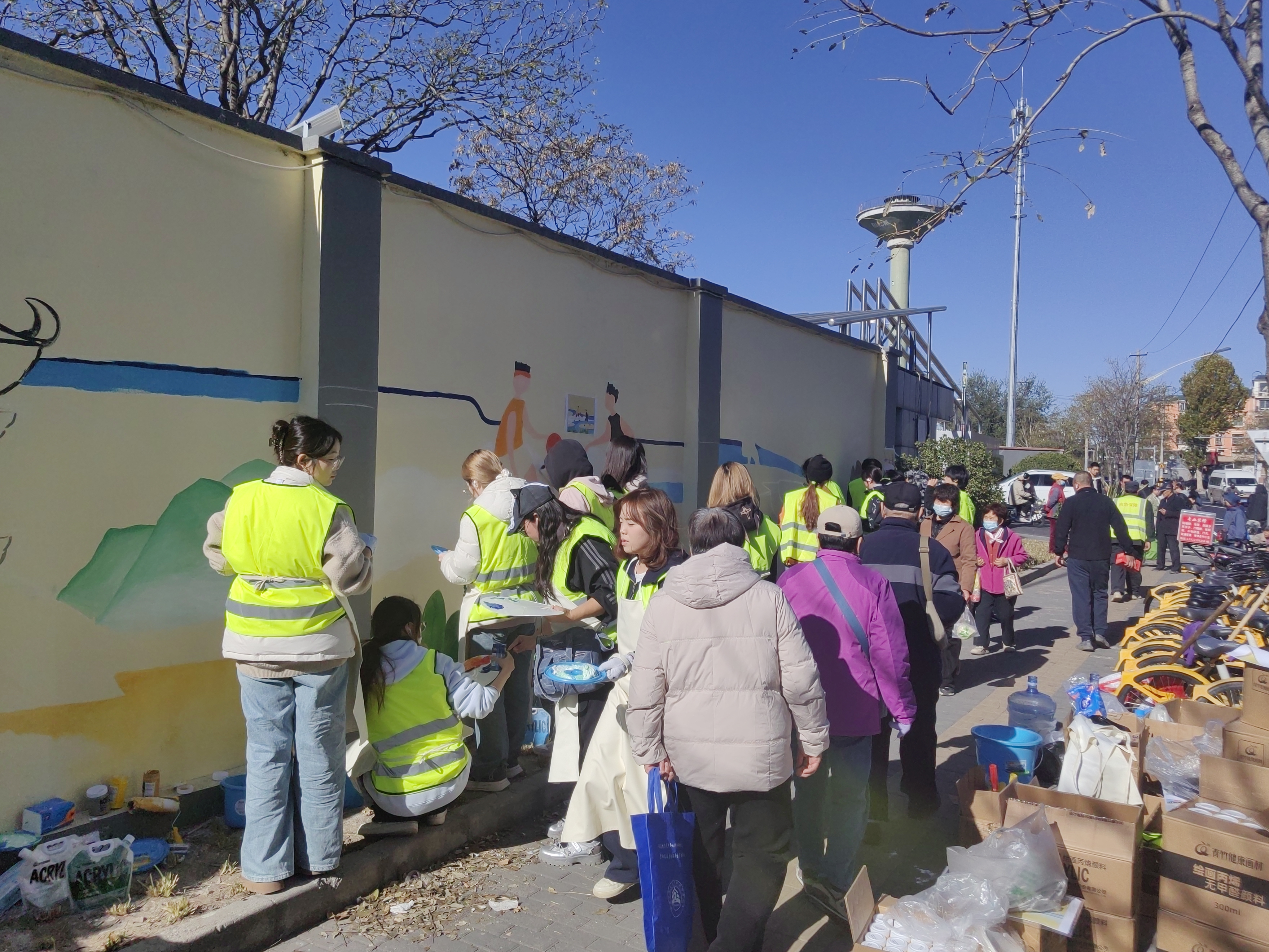自2024年6月建艺学院在丰台区宛平街道绘制长达1里的墙绘作品《永定河全域长卷图》以来,得到了当地政府和群众的一致好评。一年之后,应当地街道邀请,建艺学院再次组织师生对《永定河全域长卷图》进行增绘和修补。学院党委对此次任务高度重视,多次组织实地踏勘,与宛平街道落实任务细节,经过充分准备后,11月1日派出以建筑本科学生第一党支部和视觉传达本科学生党支部为主共44名学生党员和入党积极分子参加墙绘,由支部书记宋睿和张鹏程老师现场全程指导。