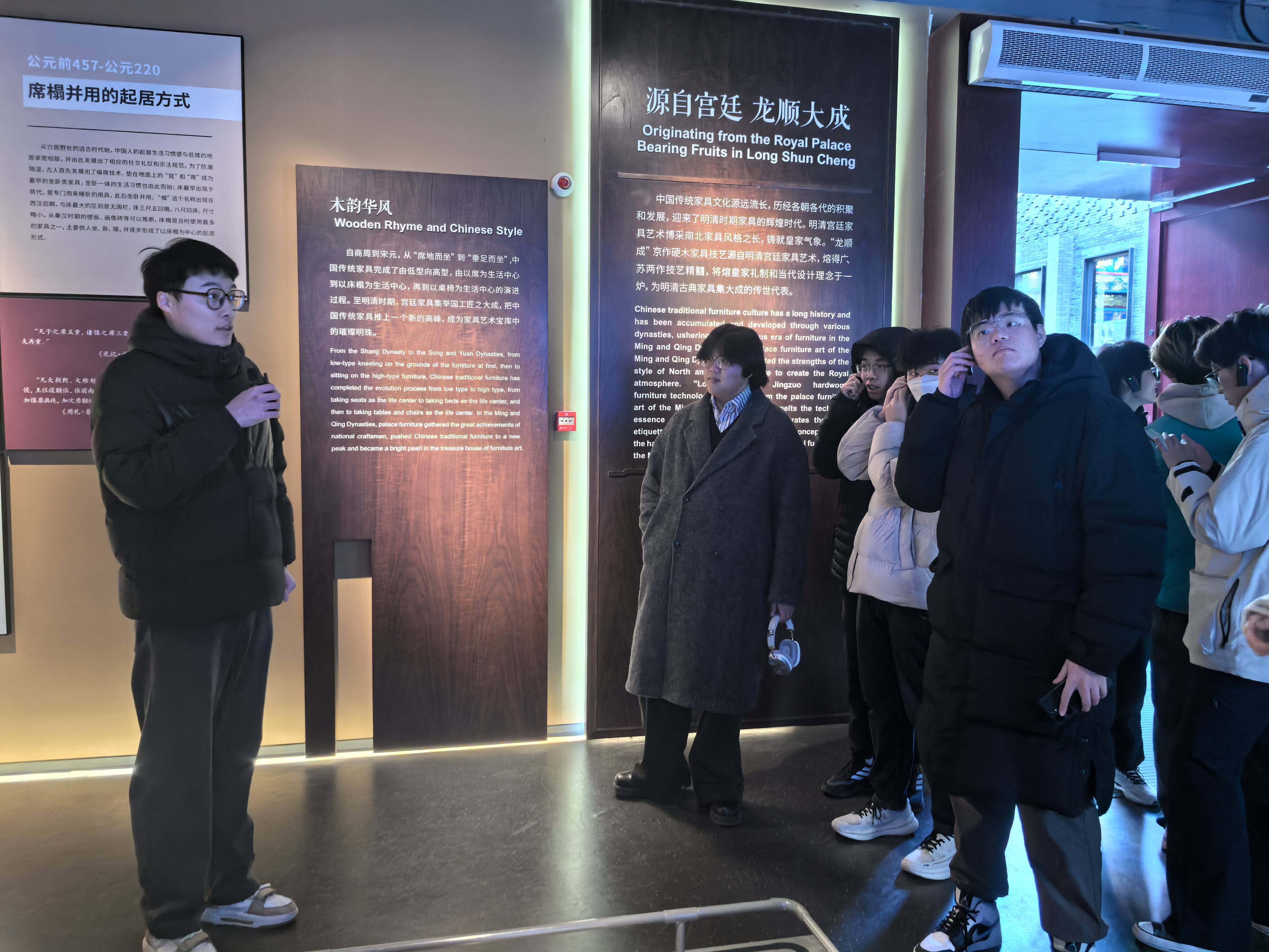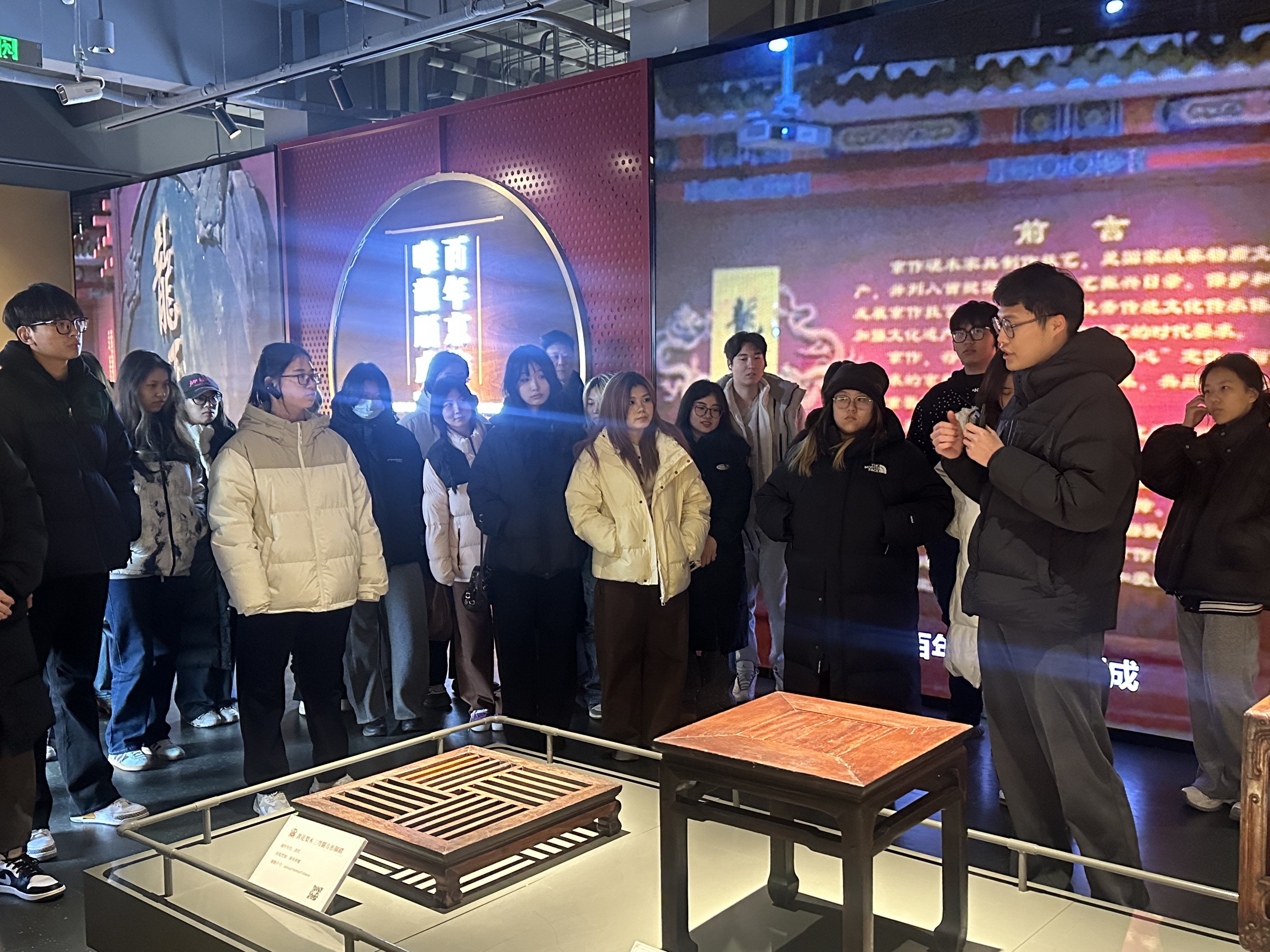 随后,师生走进龙顺城明清家具非遗博物馆,置身于中国传统木作的艺术殿堂。馆内陈列的明清红木家具珍品,以精巧绝伦的榫卯工艺、典雅匀称的造型比例与深沉的文化意蕴,彰显出中式家具独有的匠心美学。同学们近距离观摩家具的构造细节与纹饰脉络,聆听近现代家具在工艺、形态与功能上演进的故事,也为今后从事空间设计积累了丰富的传统文化素材。