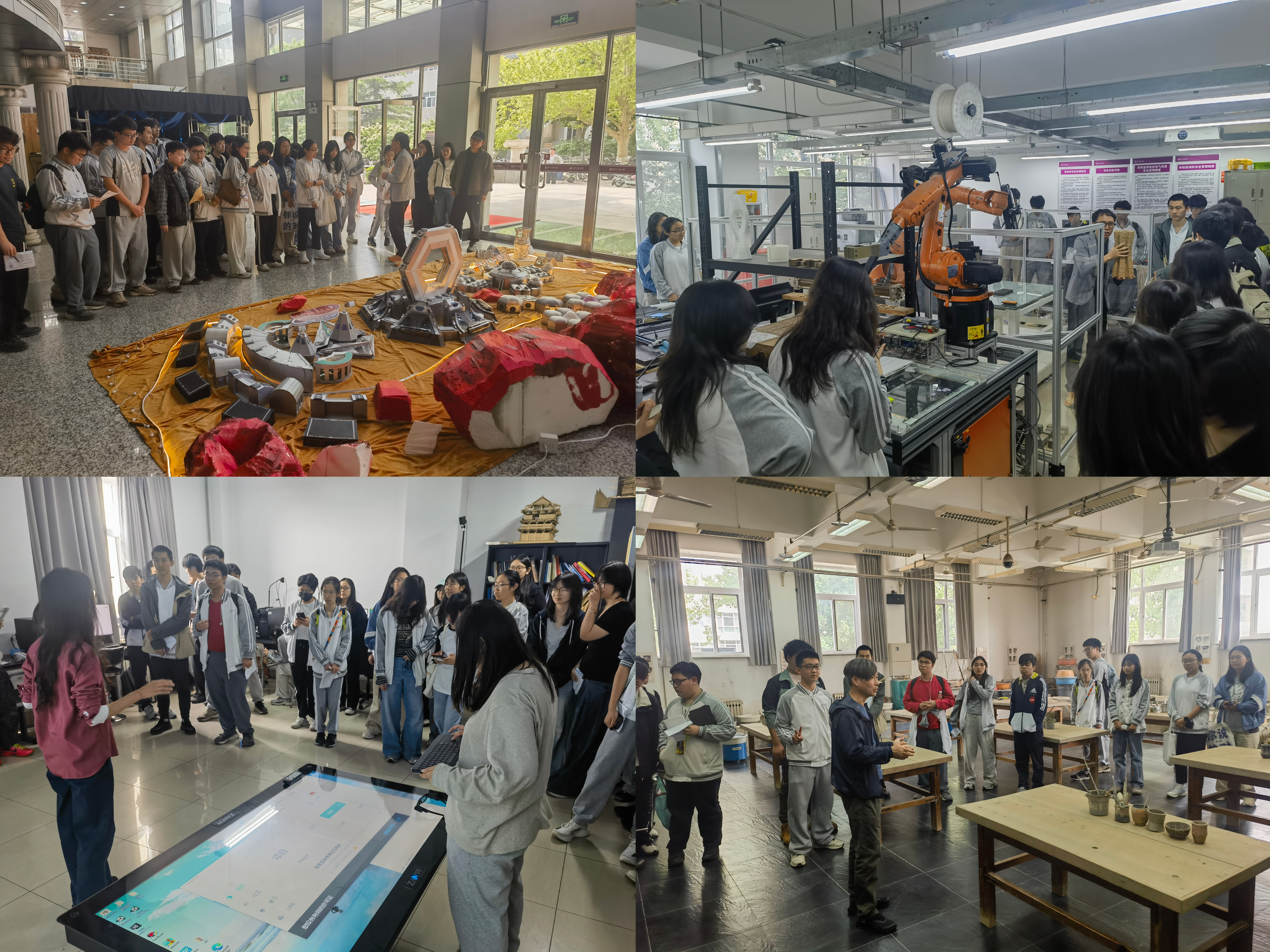 上午,来访师生首先来到建筑与艺术学院参观由建筑系主办的“未来科幻&空间交互展”;在智能建造机器人实验室观摩了由靳铭宇老师应用机械臂和3D打印技术制作的建筑模型;在VR实验室,同学们亲自观看并体验了由张一梦老师开发的“景观VR系统”;在陶艺实验室,黄春平老师向同学们展示了充满艺术魅力的陶艺作品。