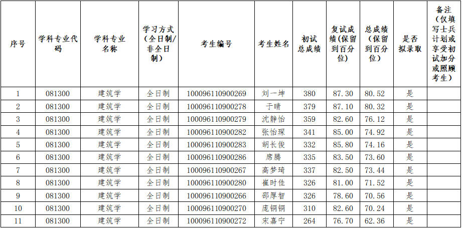 2026年建筑学(081300)第一批次复试结果名单(01建筑设计及其理论方向)公示如下: