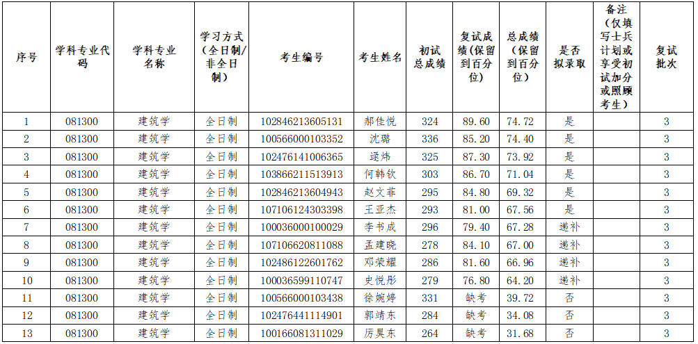 2026年建筑学(081300)第三批次拟录取名单(01建筑设计及其理论方向 )公示如下: